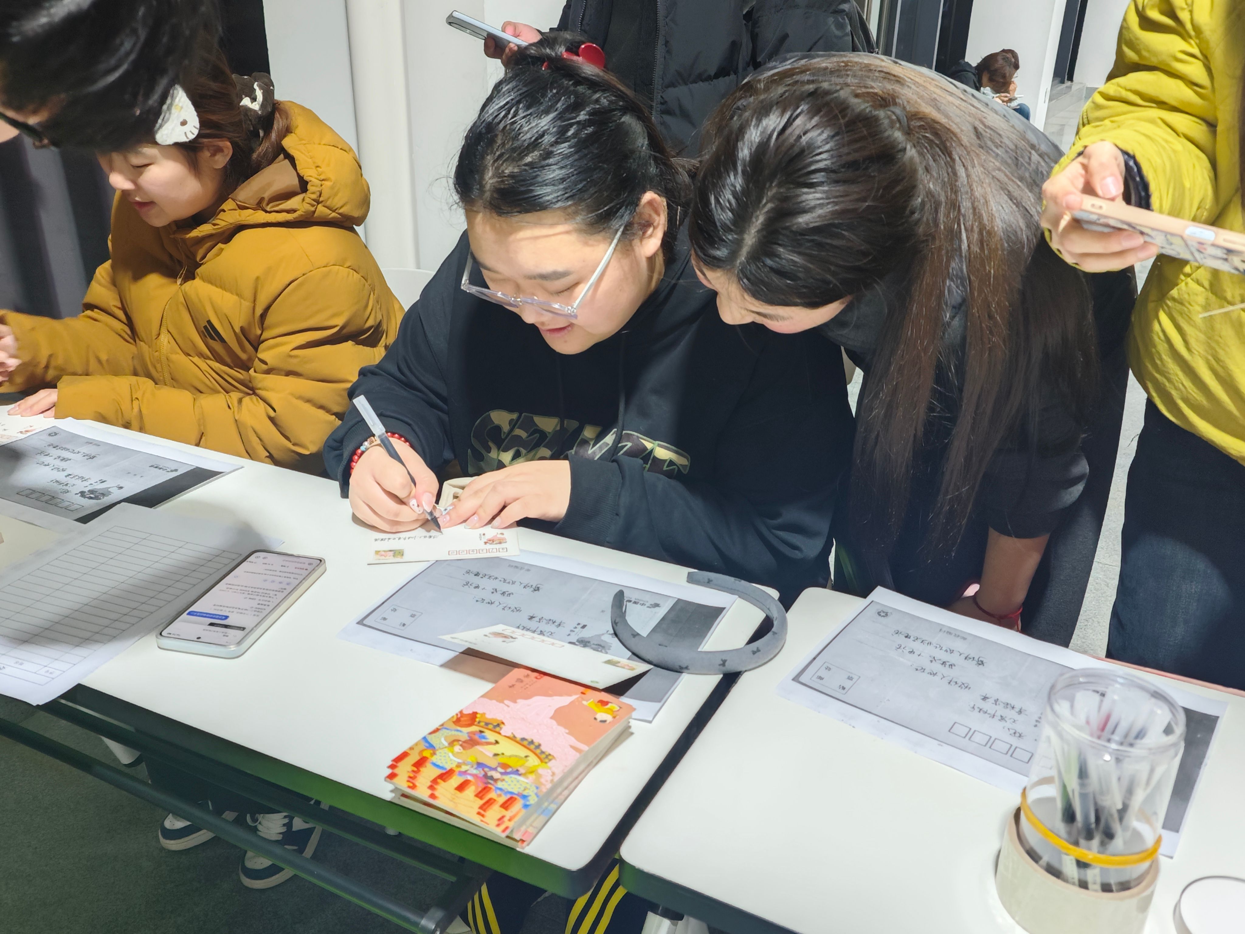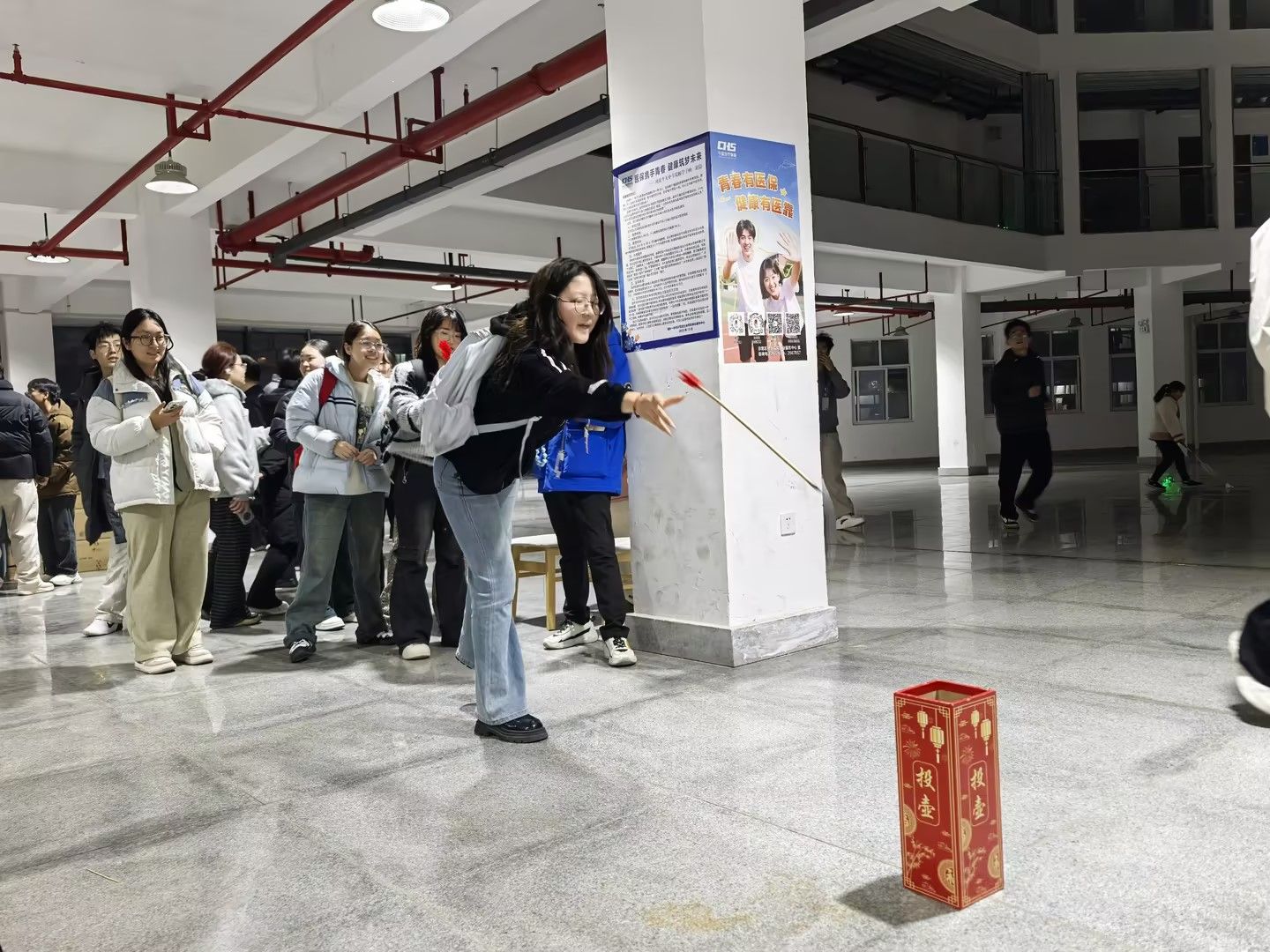在大学生活动中心门前,猜灯谜活动区围满了同学,大家或驻足凝思,或三两成群热烈讨论,在智慧的碰撞中感受着汉字的博大精深。活动中心一楼大厅内,各项活动同步展开:“遥寄相思”明信片代寄活动为同学们提供了一个传递情感、寄托祝福的温馨平台;趣味套圈和传统投壶活动前更是排起了长队,欢笑声、喝彩声此起彼伏;而作为亮点的“元宵节AI作诗大比拼”活动,则将传统佳节与前沿科技相结合,让同学们在体验诗词之美的同时,也感受到了科技带来的创新乐趣。