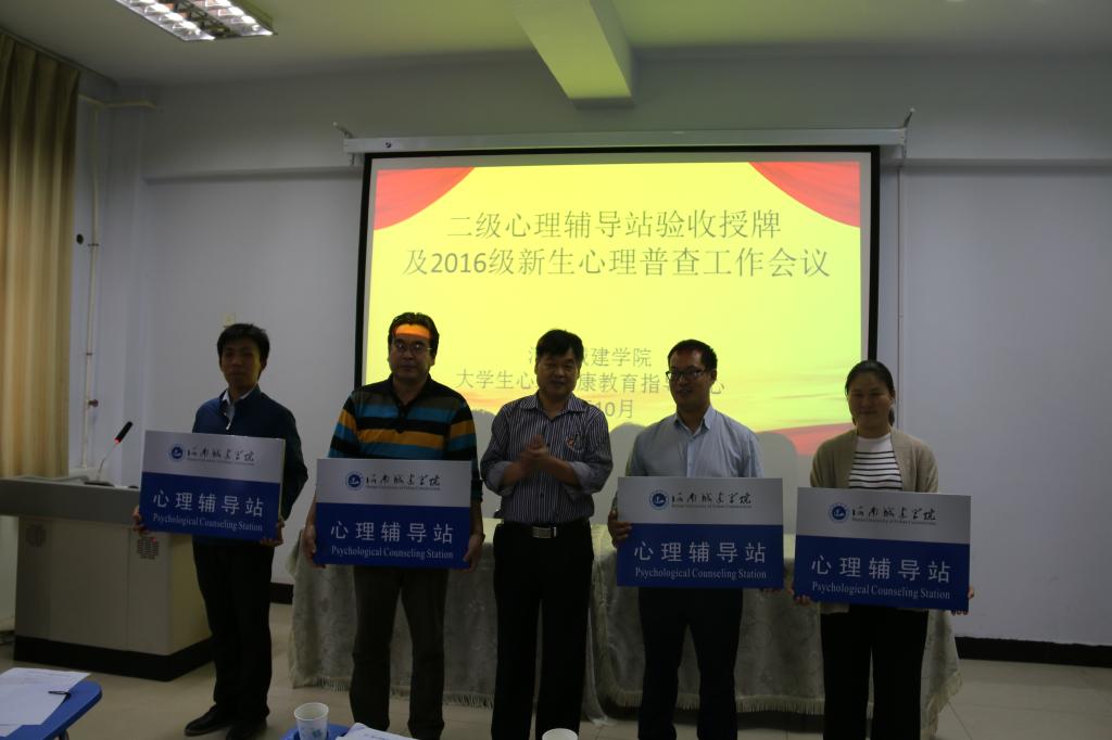 各学院对二级心理辅导站建设及工作运行情况进行了汇报,由党委宣传部副部长、校报编辑部主任杨璐,学生处副处长、资助管理中心主任樊昀英,团委副书记欧阳华澍及各学院书记组成的评审组对各学院二级心理辅导站建设情况进行了评分。最终全校15个学院的二级心理辅导站都顺利通过验收。张坤书对二级心理辅导站通过验收的学院表示祝贺,并为他们授牌。