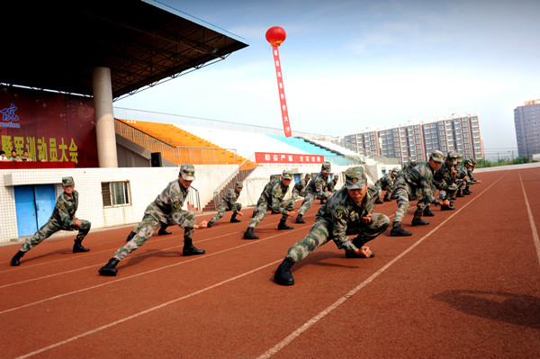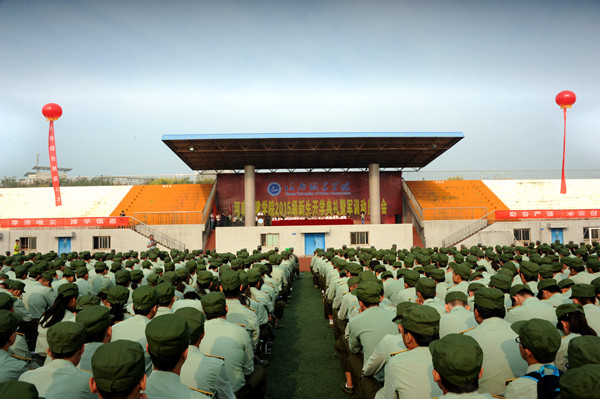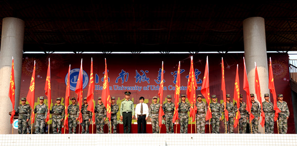 典礼结束后,武装部就2015级新生军训工作作了具体部署,副校长张坤书、军训团团长殷盘举向各连授旗,张坤书下达军训开始命令,部队教官进行了队列和军体拳示范表演。