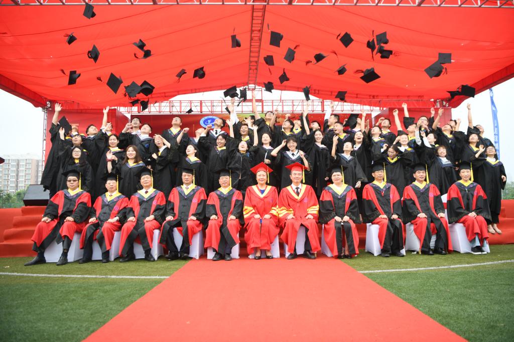 典礼在庄严雄壮的国歌声中拉开帷幕。党委书记张惠贞、校长王召东共同为44名毕业生代表正冠拨苏、颁发学位证书并合影留念。